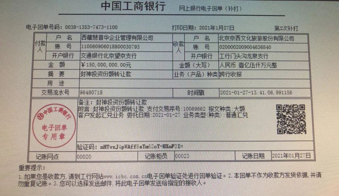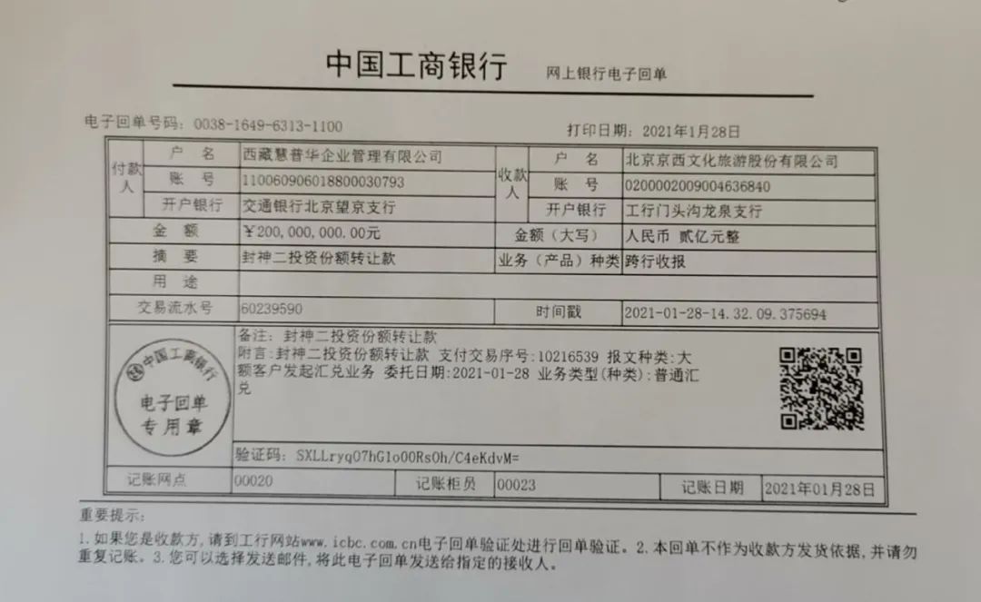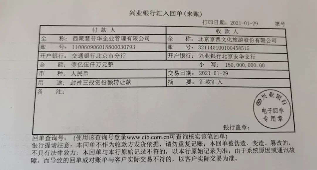 2021年1月,眼看5亿贷款到期,三笔来自西藏慧普华总计5亿元的款项打到了北京文化的账户上,转账缘由为“封神股权份额转让款”,用以偿还银行贷款。2021年4月,北京文化公布的交易公告中才披露,西藏慧普华是《封神三部曲》影片各25%份额的接盘方。