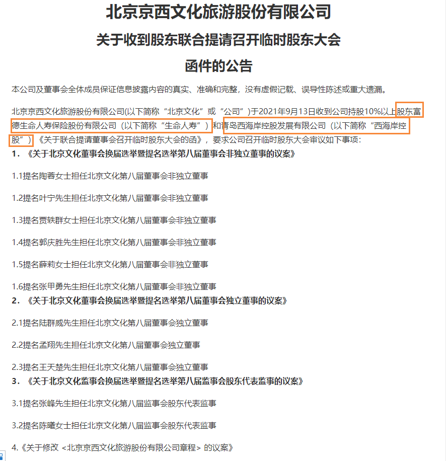 至此,ST北文的权力斗争格局已非常清晰:第一大股东富德生命人寿保险股份有限公司(以下简称“生命人寿”)、第二大股东青岛西海岸控股发展有限公司(以下简称“青岛西海岸”)组成的阵营,要求对董事会进行全面改组;原董事会则提议更多代表己方势力的人选入局。