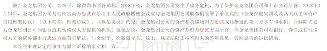 资本市场上,万忠波与上市公司金龙机电(300032.SZ)的往事由来已久。金龙机电2016年三季报显示,金龙机电的控股股东金龙控股集团有限公司(以下简称“金龙集团”)、万忠波为排名前十的无限售条件股东。每经记者在中国裁判文书网上查询到一份2018年的民事判决书中显示,2018年年初,金龙集团发生债务危机,金龙集团与台州富商万忠波签订了“资产重组框架协议”,金龙集团的资产和负债均归万忠波或其指定的第三方享有和承担。