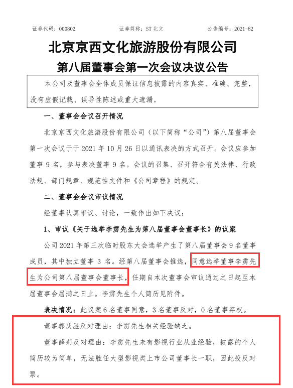 10月26日晚,ST北文公告称,第八届董事会投票选举出了李雳为新任董事长。郭庆胜、薛莉以“李雳没有影视行业从业经验”为由提出反对,但改变不了结果。