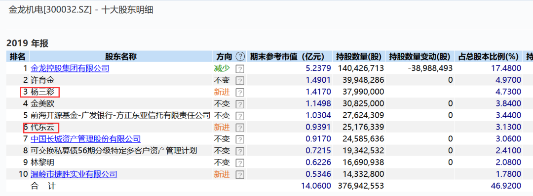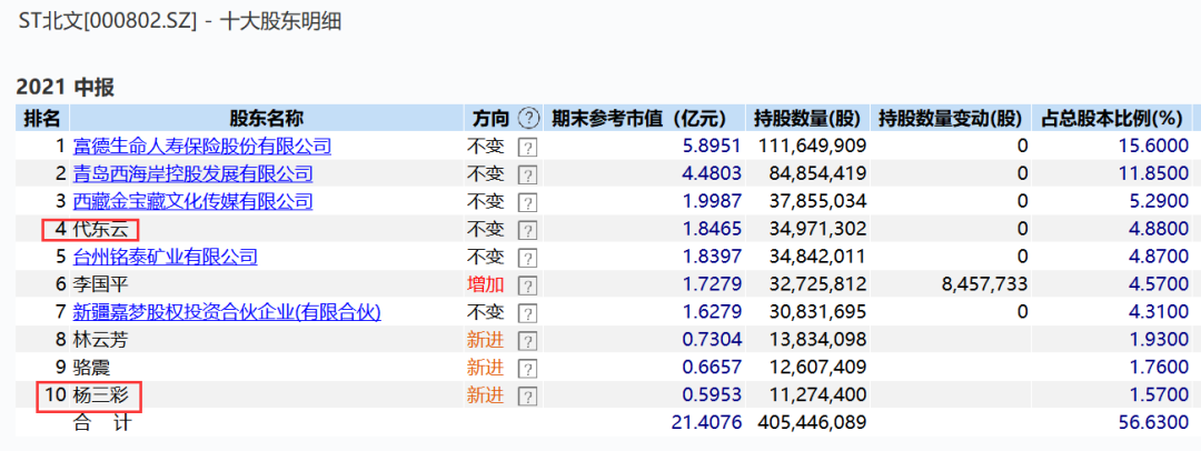 另根据金龙机电2019年年报,杨三彩、代东云是该公司前十大股东,这两个名字同样出现在ST北文2021年中报的前十大股东之列。