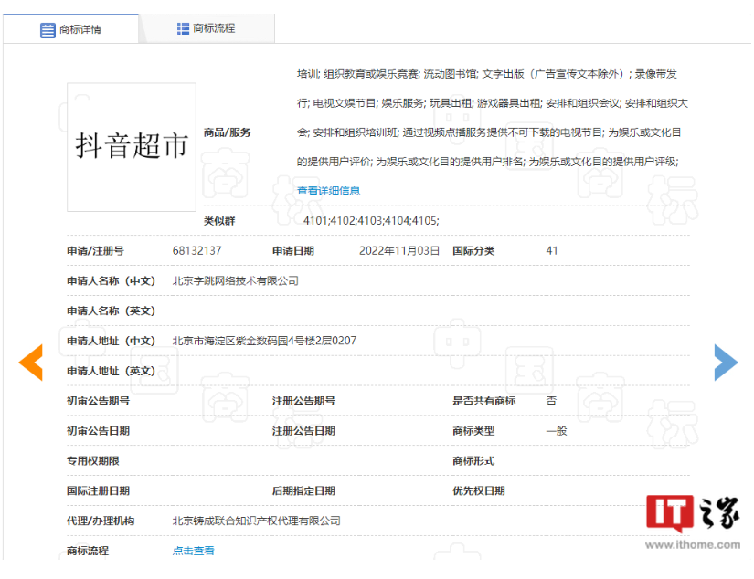 11 月 22 日消息:据国家知识产权局中国商标网,北京字跳网络技术有限公司近日申请注册“抖音超市”商标,国际分类为广告销售、教育娱乐,当前商标进度均为申请中。
