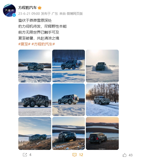 从图片中可以看出,主角仍是方程豹品牌的首款车型 —— 内部代号“SF”,定位新能源硬派越野,号称对标奔驰 G 级。据微博汽车博主 @卟卟宏 表示,本次拍摄位地点是内蒙牙克石。图片中,新车通过了雪地、森林、山坡、砂石路面等场景,意在展现其具备较高的通过性,与其定位硬派越野的身份较为相符。