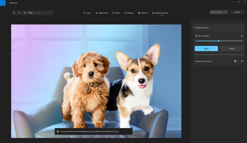 打开照片之后在编辑模式下可以启用“Background Blur”选项,Windows 照片应用会自动计算画面主体,通过虚化背景达到增强主体的效果。