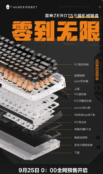 9 月 15 日消息,雷神宣布推出一款 ZERO75 三模机械键盘,首发价 299 元,将于 9 月 25 日 0 点预售。