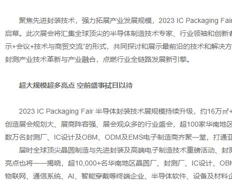 聚焦先进封装技术,强力拓展产业发展规模,2023 IC Packaging Fair 半导体封装技术展即将于2023.10.11-13, 深圳国际会展中心(宝安)盛大启幕。此次展会将汇集全球顶尖的半导体制造技术专家、行业领袖和创新者,围绕封测厂、晶圆厂、IC 设计,以IC Packaging + PCBA ,采用“示范展示+会议+技术与商贸交流”的形式,共同探讨和展示最前沿的技术和解决方案,助力企业高效、强力拓展华南地区半导体封测行业目标客户,助推中国封测产业技术革新与产业融合,点燃行业全链路发展新引擎。