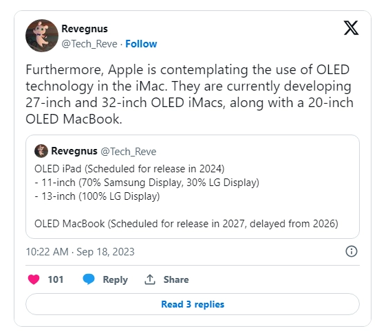 9 月 21 日消息,消息源 @Tech_Reve 近日透露,苹果公司正在测试 27 英寸和 32 英寸的 OLED 面板,有望应用于下一代 iMac 设备上。