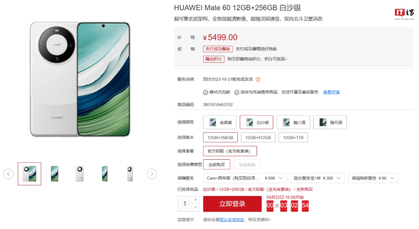 原标题:华为 Mate 60 机型 12GB+256GB 版本上架,今日 10:08 开售
