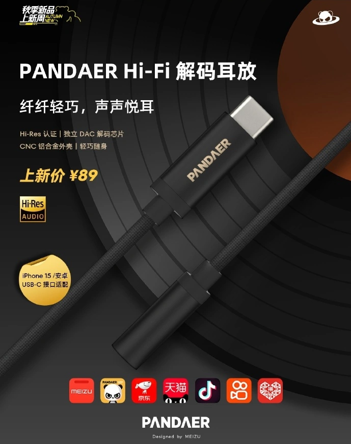 10 月 10 日消息,魅族上新了一款 PANDAER Hi-Fi 解码耳放,尝新价 89 元,现已在各大电商平台推出。
