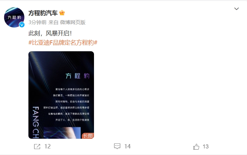 6 月 9 日消息,与此前爆料的一致,比亚迪 F 品牌确定命名为“方程豹”。今日上午,“方程豹汽车”官方微博发布了第一条内容,宣布“此刻风暴开启”。