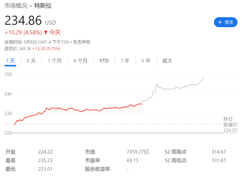 受此消息影响,特斯拉和通用汽车的股价在盘后一度双双涨超 4%。其中特斯拉股价最终报收 234.86 美元(当前约 1.670.39 人民币),上涨 4.58%,这已是其连续第十个交易日上涨,创下自 2021 年 1 月以来最长连涨纪录。