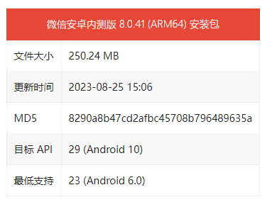 8 月 26 日消息,微信安卓平台迎来了 8.0.41 测试版更新,本次更新安装包文件详细信息如下: