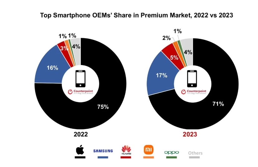 根据数据,苹果以高达71%的份额领先高端市场,但与去年相比下降了4%。韩国品牌三星在 S23 系列推动的高端智能手机市场中占有 17% 的份额。华为以5%的份额位居第三,由于Mate 60手机,比去年增长了2%。小米和OPPO分别占据了2%和1%的市场份额。根据该研究公司的说法,可折叠手机也已成为高端市场的差异化因素。