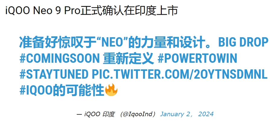 上周,iQOO 在中国推出了 Neo 9 系列智能手机。该系列包括标准型号和专业型号。这两款手机都具有高级规格。现在,Vivo 子品牌的印度分公司正式确认了 Neo 9 Pro 在印度的存在。iQOO 在 X(前身为 Twitter)上取笑该设备在该国的到来。