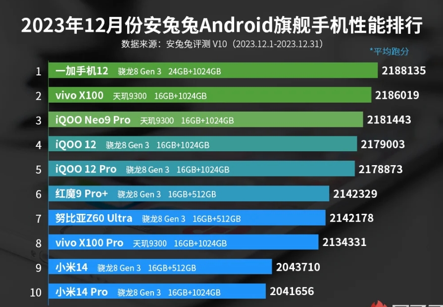 2023 年 12 月安兔兔前 10 名(按性能):
