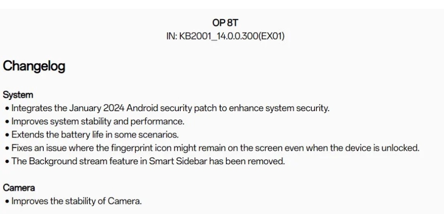 OnePlus 8T 带来了最新的安全补丁,以及系统稳定性和性能改进。它甚至延长了电池寿命,并修复了即使在解锁智能手机后仍会持续显示的指纹图标。此外,智能边栏中的后台流功能现已删除。它甚至为智能手机相机添加了一些稳定性修复。