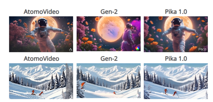 例如,在太空中宇航员的比较样本中,当 Gen-2 四处走动时,反光玻璃覆盖物或遮阳板刚刚从 Gen-2 的样本中消失了。虽然AtomoVideo使运动相对简单,但它并没有产生这样的结果。在另一个比较样本中,Gen-2 描绘了人们在雪地上飞行时消失,而 Pika 1.0 则在斜坡上展示了一些难以用物理学定义的奇怪运动。AtomoVideo再次保持相对简单,但设法避免了此类错误。尽管如此,这些比较样本很可能是一些精选样本,而不是随机生成的样本。