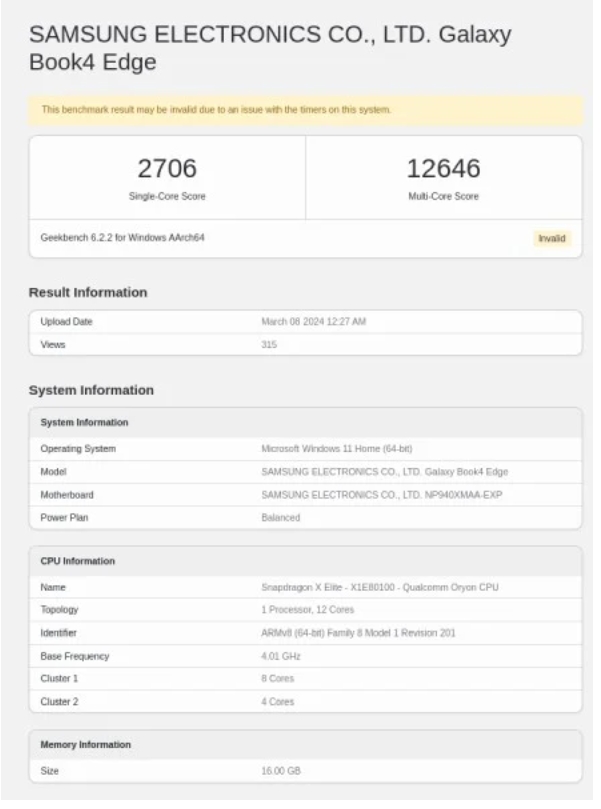 搭载骁龙 X Elite 的 Galaxy Book 4 Edge 实现了令人印象深刻的 Geekbench 6.2.2。得分:单核 2,706 分,多核测试高达 12,646 分。