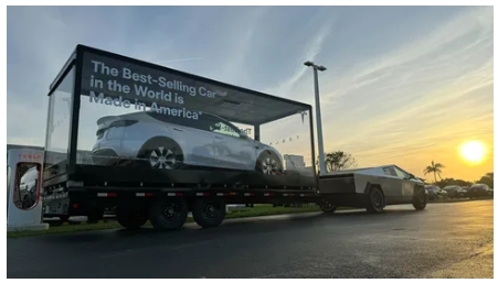 似乎是为了在不诉诸不寻常的全国性广告覆盖的情况下敲定这一点,特斯拉现在已经将一辆装有Model Y的玻璃拖车挂在了Cybertruck上。透明拖车上的文字说“世界上最畅销的汽车是美国制造”,指的是去年Model Y的畅销状态,击败了丰田汽车。