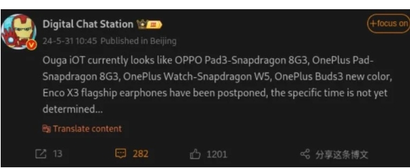 推迟的产品包括搭载骁龙 8 Gen 3 芯片的 Oppo Pad 3 和 OnePlus Pad、配备骁龙 W5 的 OnePlus Watch、OnePlus Buds 3 的新颜色选择以及旗舰 Enco X3 耳机。